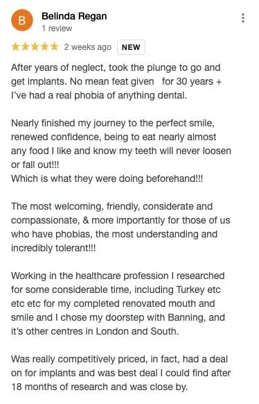 Our clinics have over 400 five-star verified Google Reviews. We make dreams come true by transforming smiles, and that's why our patients love us. Read what some of them have to say about their experience...